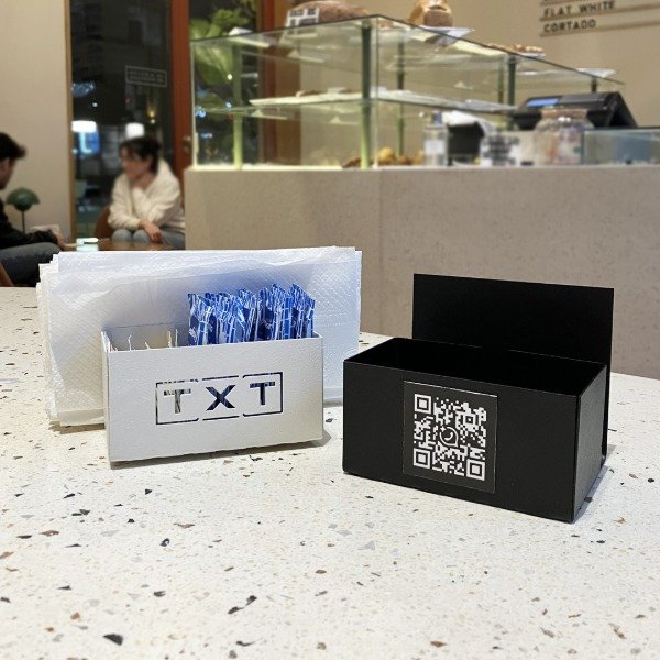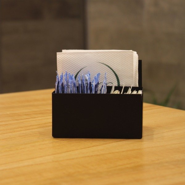 Servilleteros con cavidad para sobres de azúcar y edulcorante. El acabado estándar es pintura al horno color blanco o negro microtexturado.